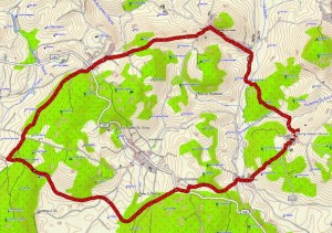 La promenade traverse un paysage vallonné avec des forêts et des terres agricoles, avec le village occasionnel.